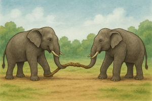 யானைகள் இரண்டு திடீரென முரண்பட்டுக்கொண்டு கயிற்றின் நுனியை ஆளுக்கொரு பக்கம் பிடித்து எதிரெதிர் திசையில் இழுத்தால் எப்படி இருக்கும்?